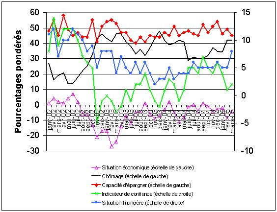 - L'indicateur de confiance des consommateurs constitue la moyenne arithmétique des soldes pondérés des quatre questions suivantes: