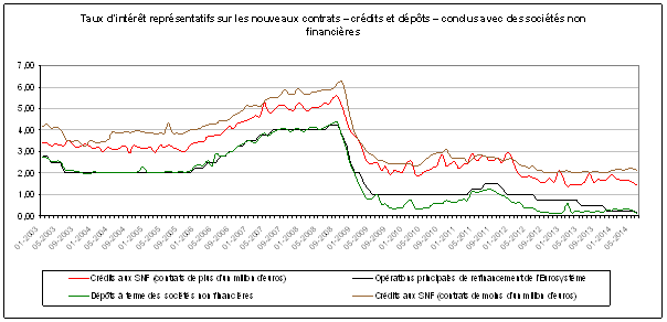 Le taux d'intérêt variable sur les crédits d'un montant supérieur à 1 million d'euros accordés aux sociétés non financières est en baisse de 15 points de base, par rapport au mois précédent, pour atteindre 1,42%. Le volume de ces crédits nouvellement accordés est de 6 751 millions d'euros, soit une hausse de 400 millions d'euros, par rapport au mois précédent. En comparaison annuelle avec le mois de juin 2013, ce taux est en baisse de 15 points de base et le montant des crédits accordés est en baisse de 1 137 millions d’euros.
