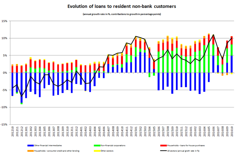 Loans to resident non-bank customers increased by 1 665 million euros, or 2.1%, between September 2016 and October 2016. Between October 2015 and October 2016, these loans increased by 7 236 million euros (10.1%).