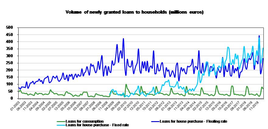 The variable[2] interest rate on mortgage loans granted to households has decreased by 5 basis points on a monthly basis to reach 1.48% in March 2019, whereas the volume of these newly granted loans has increased by 74 million euros to reach 283 million euros. On a yearly basis, the interest rate has decreased by 8 basis points whereas the volume of newly granted loans has increased by 21 million euros.