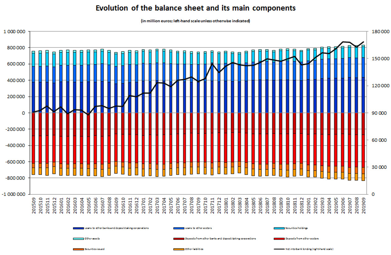 Net interbank lending, that is to say the difference between interbank loans and deposits, increased by 5 452 million (3.3%) to reach 168 283 million euros at the end of September 2019.