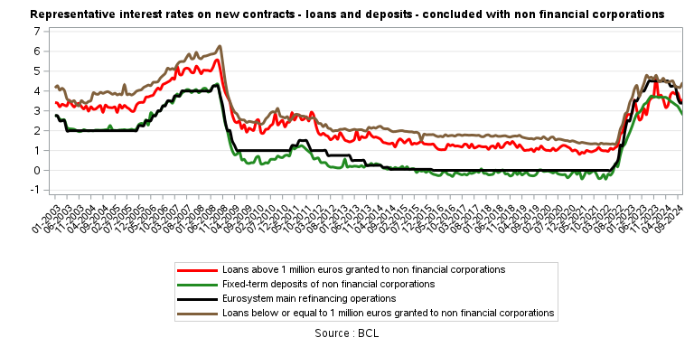 The Banque centrale du Luxembourg (BCL) informs that, based on preliminary data, the main interest rates applied by Luxembourg’s credit institutions to euro area households and non-financial corporations (NFCs) for their loan and deposit operations have on average evolved as follows in January 2025.