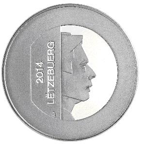- au revers figurent le portrait de Son Altesse Royale le Grand-Duc Henri – œuvre de l’artiste luxembourgeoise Madame Yvette Gastauer-Claire -, l’indication « LËTZEBUERG » ainsi que le millésime « 2014 » ;