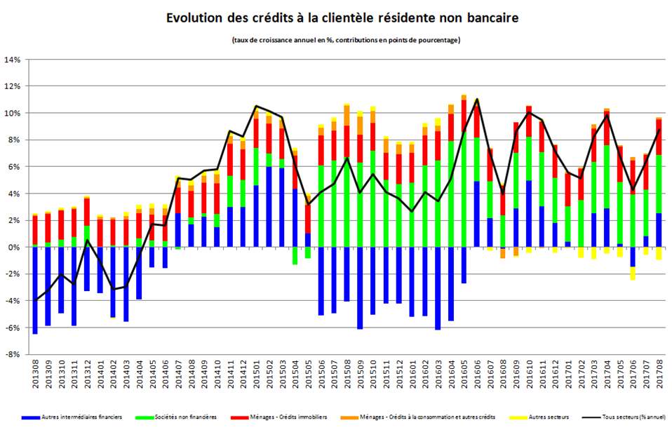 Les crédits à la clientèle non bancaire résidente ont augmenté de 674 millions d'euros, soit 0,8 % entre juillet 2017 et août 2017. Entre août 2016 et août 2017, ces crédits se sont accrus de 6 553 millions d'euros, soit 8,7 %.