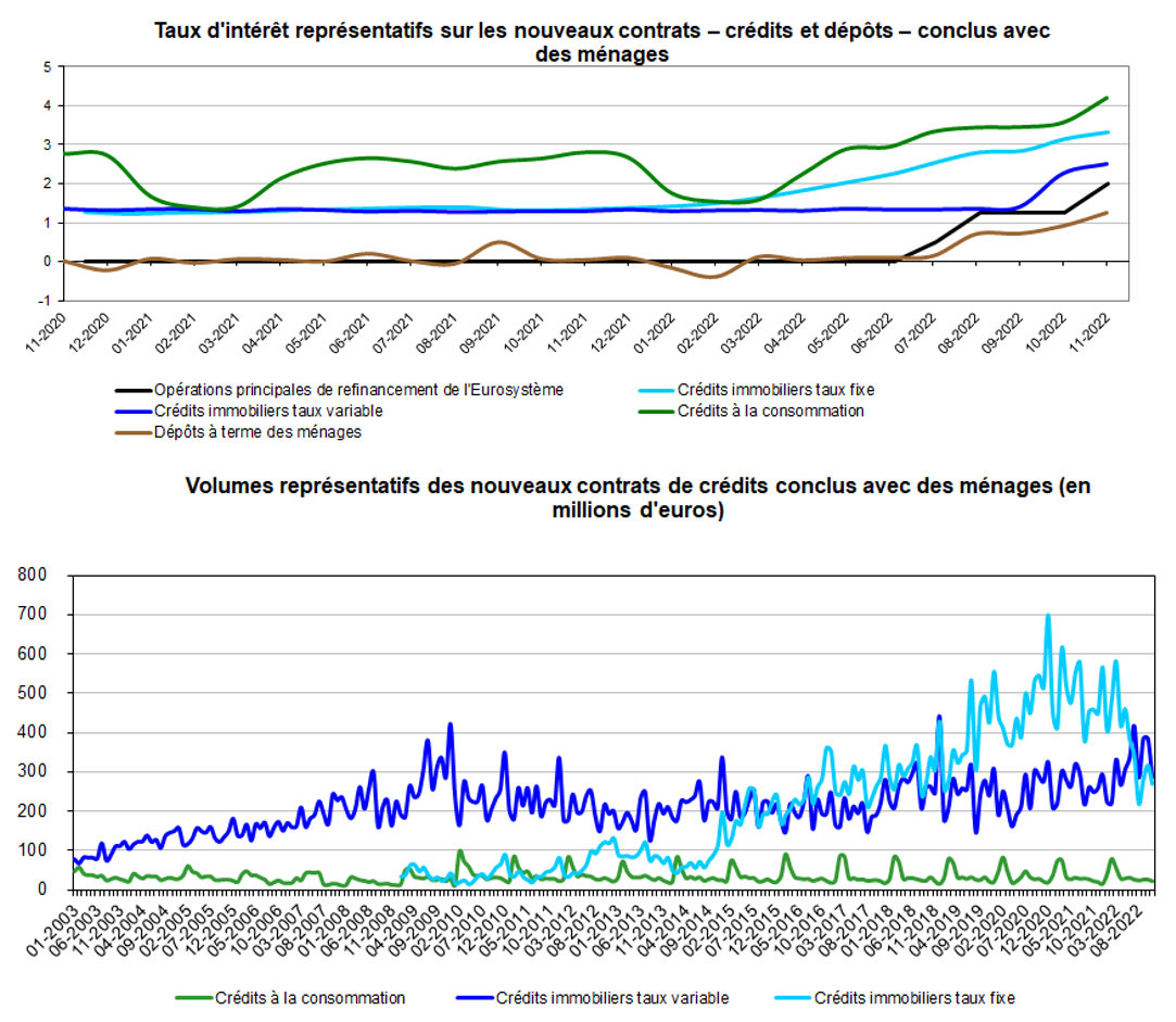 10 ans ont progressé de 14 points de base pour s’établir à 3,31% en novembre 2022. Le volume mensuel de ces créances nouvellement accordées a diminué de 39 millions d’euros en comparaison mensuelle pour atteindre 224 millions d’euros en novembre 2022. En glissement annuel, le taux a progressé de 188 points de base tandis que le montant des crédits accordés s’est contracté de 100 millions d'euros. Il est important de noter que ce taux inclut des périodes de fixation initiales de taux supérieures à 10 ans et qu’il est calculé sur base d’un échantillon de banques. Le taux indiqué pour la période de fixation initiale est une moyenne pondérée prenant en compte les volumes des prêts octroyés. Les taux sur des prêts avec des périodes de fixation initiales très longues, comme par exemple 30 ans, peuvent donc être largement plus élevés que le taux moyen pondéré indiqué.
